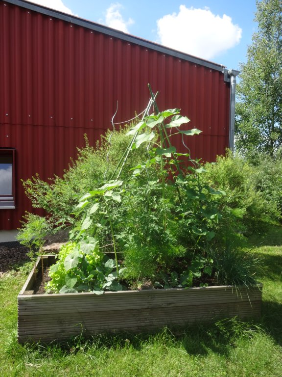 Hochbeet mit Salat und verschiedenen Gemüsearten